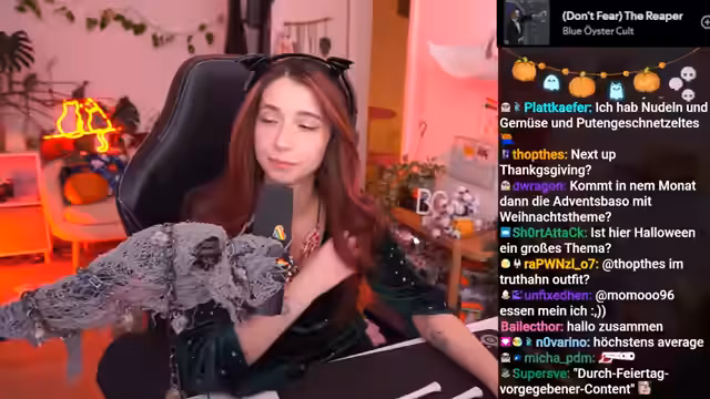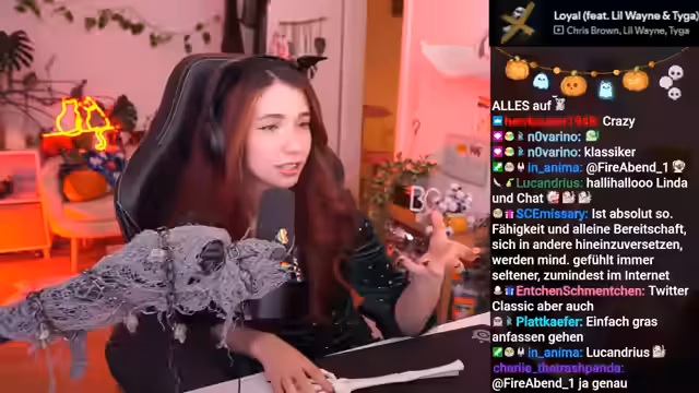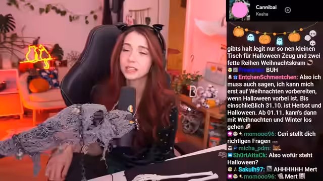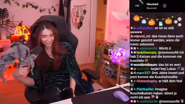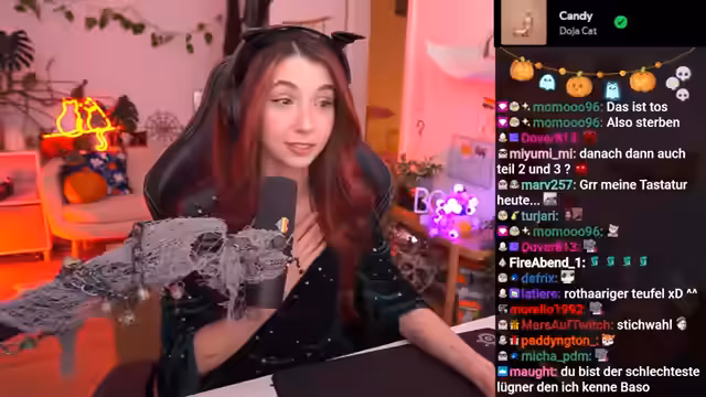 04:41:55Die Streamerin zeigt weitere Halloween-Dekorationen, darunter zwei Ratten-Skelette, die sie ursprünglich für die Katzen als lustig empfand, aber feststellt, dass diese die Katzen eher verstören. Sie präsentiert die 'beste' Halloween-Deko, die sie bestellt hat: eine kleine, schwere, schwarze Katze mit einem Hexenhut. Sie ist überrascht von der geringen Größe der Katze, da sie auf den Bildern größer aussah, findet sie aber trotzdem süß und wichtig für ihre Sammlung. Luni zeigt keine Angst vor dieser Dekokatze und tarnt sich sogar in der Halloween-Dekoration. Die Streamerin reflektiert, dass sie aufgrund der vielen Gespräche und Interaktionen mit den Katzen nicht dazu gekommen ist, den geplanten Kürbis zu schnitzen, obwohl sie sich extra dafür geschminkt hatte. Sie plant, das Kürbisschnitzen am nächsten Tag oder am Freitag nachzuholen.