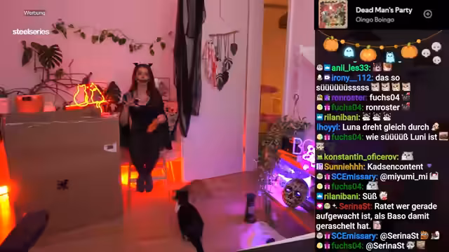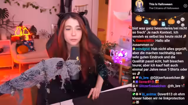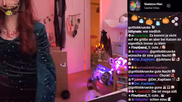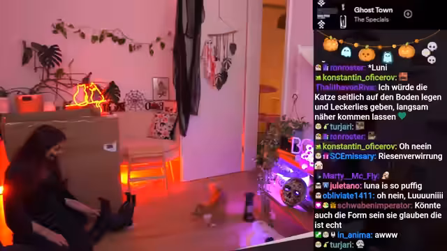 Bei der Präsentation der neuen Halloween-Deko zeigten die Katzen starke emotionale Reaktionen. Eine übergroße Gummikatze führte bei Ferox zu Panik, während Luna neugierig und misstrauisch blieb. Weitere Deko-Objekte wie eine Skelettratte und eine animierte Fledermaus verstärkten die ungewohnte Atmosphäre im Stream.