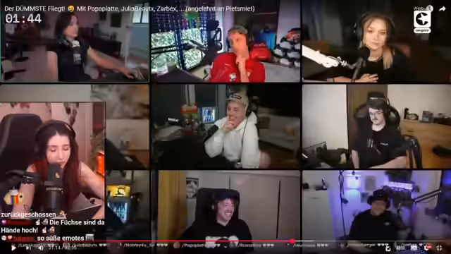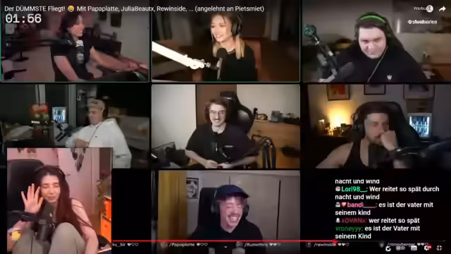 00:55:44Die Streamerin kündigt an, dass sie morgen an "Der dümmste Fliegt" teilnehmen wird und Angst hat, als erstes rauszufliegen. Sie erklärt, dass sie sich wenig mit Politik und Mathe auskennt, und erkennt an, dass man im Streamingberuf nicht alles wissen muss. Sie beschließt, heute noch ein YouTube-Video mit Allgemeinwissen-Fragen anzusehen, um sich etwas vorzubereiten. Sie macht sich jedoch auch klar, dass sie nicht alles aufholen kann und vor allem Mathe und Politik nicht beherrscht. Sie äußert die Hoffnung, dass es mehr Fragen zu Tieren oder Katzen gibt.