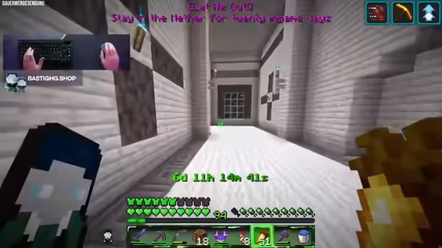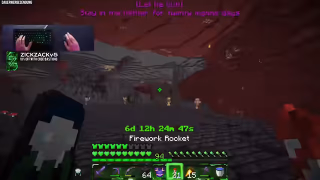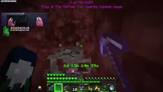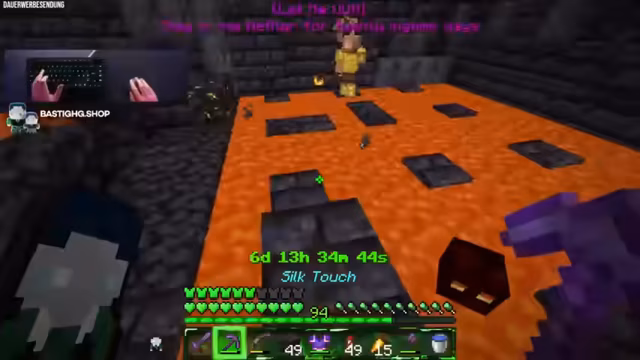 00:42:44Der Streamer ist nun offiziell im Nether und muss die verbleibende Zeit von fast 400 Minuten überbrücken. Um die Zeit sinnvoll zu vertreiben, entscheidet er sich dafür, Bastionen zu plündern und Ancient Debris sowie Gold zu farmen. Dabei spricht er über seine Farmen und erläutert, dass er während der Exploration auf die Chatinteraktion angewiesen ist, um die Zeit zu überstehen. Gleichzeitig geht er auf die Zuschauerzahlen und seine eigene Erschöpfung ein, betont aber, dass die Aufgabe im Fokus steht.