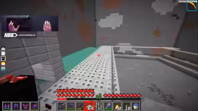 00:32:31Im weiteren Verlauf des Streams wird ein Elytra-Boost-System, das von Heiko entwickelt wurde, getestet und vorgeführt. Anstatt der verbotenen Raketen wird eine eingesperrte Breeze genutzt, die Windcharges auf einen Eisengolem schießt. Diese können dann gesammelt und als Auftrieb für die Elytra verwendet werden. Der Streamer ist von der Funktionsweise und der Effizienz des Systems sehr beeindruckt.