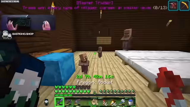 03:01:08Der Kern des Streams ist das Erreichen von 111 Custom Achievements in Minecraft. Die aktuelle Aufgabe besteht darin, alle 13 verfügbaren Villager-Varianten auf die höchste Handelsstufe, die Masterstufe, zu bringen. Dafür wird der Effekt 'Hero of the Village' genutzt, der durch einen abgeschlossenen Raid entsteht und die Handelspreise temporär senkt. Der Streamer tauscht intensiv mit den Villagern, um Edelsteine und andere Ressourcen zu farmen, und versucht, so viele Villager wie möglich hochzustufen.