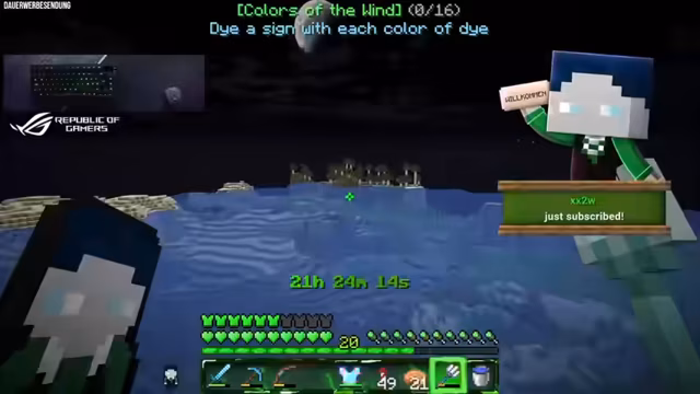 00:28:15Das nächste Achievementziel ist die Beschaffung von 16 verschiedenen Farbstoffen. Der Streamer fliegt dazu in verschiedene Biome, um die benötigten Farben zu farmen. Er beginnt im Dschungel, um Braun zu erhalten, und sucht anschließend in der Wüste nach Kakteen für Grün. Der Prozess ist dank des bereits vorhandenen Equipaments angenehm und wird entspannt vorangetrieben. Im Anschluss werden die Farbstoffe in 16 Schildern präsentiert, um das Achievement abzuschließen.