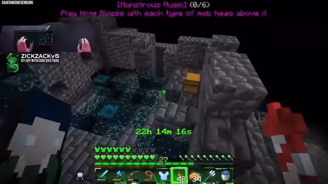 01:36:17Während die Vorbereitungen für das Mob-Köpfe-Achievement laufen, widmet sich der Streamer der Suche nach einer Ancient City, um dort einen Skelettkopf zu farmen. Er betont die strategische Bedeutung dieser für OP-Gaps und Armour Trims und dringt tief in einen Berg hinab, in der Hoffnung, eine solche Stadt zu finden. Er weist darauf hin, dass das Projekt der 111 Custom Achievements öffentlich wird, sobald alle abgeschlossen sind, um Spoiler zu vermeiden.