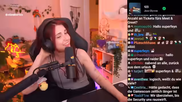 00:30:40Auf die Frage im Chat, ob sie ihre Haare selbst färbt, erklärt sie, dass sie das aufgrund ihrer komplexen Haarfarbe nicht tut. Ihre Haare müssen erst blondiert werden, bevor das Rot aufgebracht werden kann, und es gibt auch braune Strähne, was eine professionelle Handlung erfordert. Sie erwähnt, dass sie das Rot zwar öfter nachfärbt, aber die Aufhellung beim Friseur lässt. Bei der Frage nach einem eventuellen Comeback zu Valorant oder League of Legends entscheidet sie sich, erst nach der Gamescom darüber nachzudenken. Sie gibt an, bei League of Legends lange gespielt zu haben, sei es aber eine Zeit, die sie hinter sich lässt, und schätzt ihren jetzigen Lebensstil mehr.