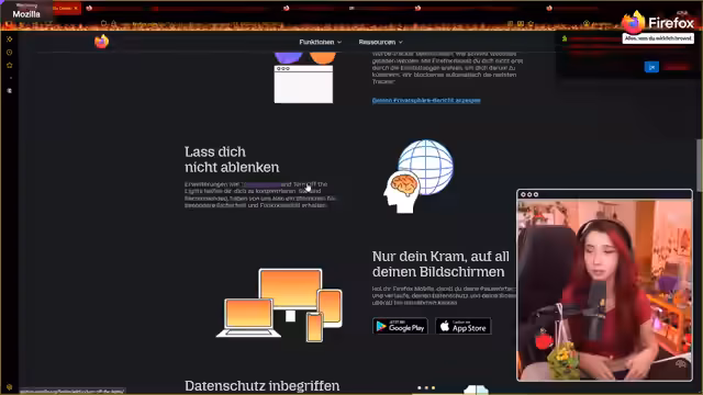 03:00:14Der Streamer stellt den Firefox Browser als etablierte Alternative vor, die seit über 20 Jahren existiert und Millionen von Nutzern hat. Er erläutert die Vorzüge, wie die einfache Bedienung, die Sortierung vieler Tabs in einer Liste für bessere Übersicht und die Möglichkeit, die Browser-App auch auf dem Handy zu nutzen. Ein besonders hervorgehobenes Feature ist die Fähigkeit, sich in verschiedenen Tabs mit verschiedenen Firefox-Accounts (z.B. privat und geschäftlich) einzuloggen, ohne sich ständig neu anmelden zu müssen.