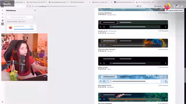 01:04:50Im Stream wird der Fokus auf die Anpassbarkeit von Firefox gelegt. Der Streamer präsentiert verschiedene nützliche Erweiterungen wie 'Darkreader' für ein augenschonendes Surfen, 'Node Sidebar' als seitliche Taskleiste für Notizen und 'Zeiterfassung', um die aufgewendete Zeit auf verschiedenen Webseiten zu tracken. Zusätzlich werden Themas wie 'Nyan Cat Animated' vorgestellt, die es ermöglichen, den Browser visuell zu individualisieren und an die eigenen Bedürfnisse anzupassen.