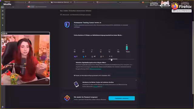 01:12:42Ein zentraler Punkt des Streams ist der integrierte Tracking-Schutz von Firefox. Dies wird als ein kleines Schild-Symbol im Browser beschrieben, das den Nutzer über blockierte Tracker auf einer Webseite informiert. Es wird erläutert, wie dieser Schutz funktioniert, worunter soziale Medien, Cookie-Anforderungen und Aktivitätsverfolgung fallen. Der Streamer hebt hervor, dass dies ein wichtiges Feature für Nutzer ist, die Wert auf Privatsphäre und Sicherheit im Internet legen, und dass es direkt vom Browser ohne zusätzliche Installationen angeboten wird.