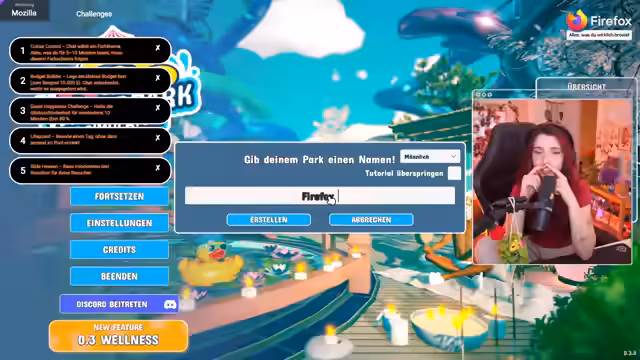 00:57:04Nach der ausführlichen Zeitkritik wechselt der Stream zu dem angekündigten Hauptereignis des Abends. Es wird die bevorstehende Kooperation mit Mozilla Firefox angekündigt und die Freude darüber ausgedrückt. Der Streamer erwähnt, dass der Stream aufgrund dieser Partnerschaft auf der Twitch-Frontpage erscheinen wird, was zu einer höheren Zuschauerzahl führen könnte. Der genaue Ablauf der Zusammenarbeit wird skizziert: Es wird eine Präsentation der Features und Anpassungsmöglichkeiten des Firefox-Browsers geben, gefolgt von zwei Spielen. Zuerst wird ein Wimmelbildspiel mit Füchsen gespielt und anschließend Waterpark Simulator mit speziellen Challenges, deren Bewältigung eine Überraschung für die Community verspricht.