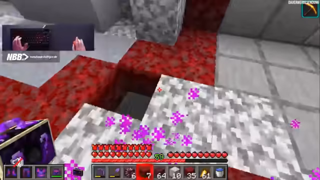 00:13:20Zurück aus einer kurzen Pause wird der Bau des Custom-Bioms fortgesetzt. Der Streamer arbeitet an der Kontur der Struktur, indem er rote Netherziegel hinzufügt, um tiefe, schattierte Linien in die Felswand einzuarbeiten. Ziel ist es, dem Bau mehr Tiefe und eine gefährlichere Optik zu verleihen. Besonderes Augenmerk liegt auf der Bearbeitung der Rückseite, die als der schwierigste Teil des Bauprojekts gilt, da dort ein sehr starker Höhenunterschied besteht.