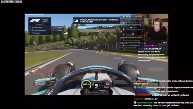 01:17:30Noriax schließt sich dem Stream per Discord-Screensharing an. Sie starten ein Rennen auf Spa, wobei der Streamer eine Testrunde fährt und Noriax seine beste Zeit von 1:40 Minuten präsentiert. Trotz technischer Probleme (Force-Feedback-Ausfall beim Streamer) beginnt das Rennen. Der Streamer startet von Position 2 und versucht, Noriax im Windschatten zu folgen. Es entsteht eine freundliche Rivalität mit Witzen über "5.000 Euro"-Wetten. Noriax gewinnt das Rennen mit deutlichem Vorsprung, was der Streamer anerkennt, aber als Motivation für zukünftige Duelle nutzt.