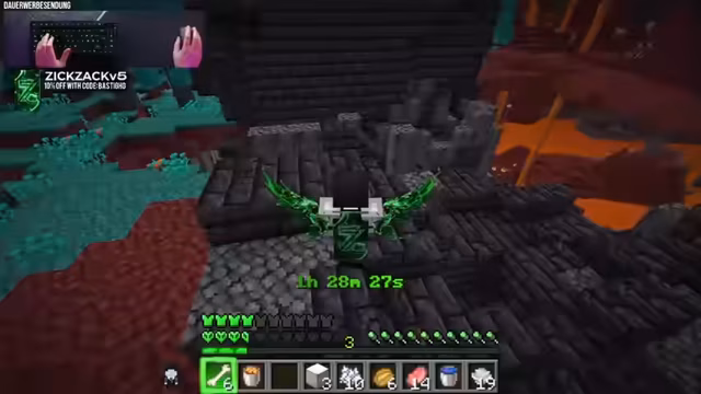 01:39:47Der Streamer suchte zunächst nach einer Ancient City, um Kisten zu plündern, fand aber keine. Trotzdem entdeckte er einen großen Vorrat an Diamanten. Um die Kistensuche fortzusetzen, entschloss er sich, in den Nether zu gehen, was sich als riskant erwies, da er weit unter der Erde war und nur einen brennbaren Wollblock hatte, um ein Portal zu entzünden. Schließlich gelang es ihm, das Netherportal zu aktivieren und die Nether-Dimension zu betreten, in der Hoffnung, in einer Bridge-Bastion weitere Kisten mit nützlichen Gegenständen zu finden. Dort angekommen, fand er Kohle und fünf Wither-Skelett-Köpfe, was zwar nützlich war, aber nicht das erhoffte Steinschwert. Nach dem Durchsuchen von zwei Kisten in der Bastion, ohne viel Nützliches zu finden, kehrte er in die Oberwelt zurück.