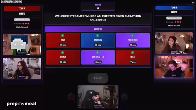 02:40:30In einer weiteren Quizrunde wird nach einer Sache gefragt, die jeder im Auto hat. Taschentücher sind nicht dabei, Autoschlüssel sind auf Platz 7. Ein Handy wird genannt und ist auf Platz 5. Eine Parkscheibe ist auf Platz 3, eine Warnweste auf Platz 4. Ein Erste-Hilfe-Set ist nicht dabei. Ein Pannendreieck wird genannt, ist aber nur auf Platz 8. Kaugummis sind auf Platz 2, Kabel sind auf Platz 10. Fahrzeugpapiere werden diskutiert. Trinken wird genannt, ist aber nicht dabei. Die nächste Frage lautet, welcher Streamer am ehesten einen Marathon schaffen würde. Kevin wird genannt und ist auf Platz 1. Trimax, Eli, Willi und Sydney werden ebenfalls genannt. Maxify ist nicht dabei. Phoebe wird genannt, ist aber nicht dabei. Sascha Huber, Schradin und Big Spin werden diskutiert. Basti GHG wird aus Joke genannt und ist auf Platz 2. Abschließend wird in einer Schnellfragerunde nach der wichtigsten Dönerzutat, einer Ausrede, warum man nicht ans Handy geht, einer Hunderasse, etwas, das man zu einer Feier mitbringt, und einem Obst, das man schälen muss, gefragt. Die Antworten werden verglichen und ausgewertet.