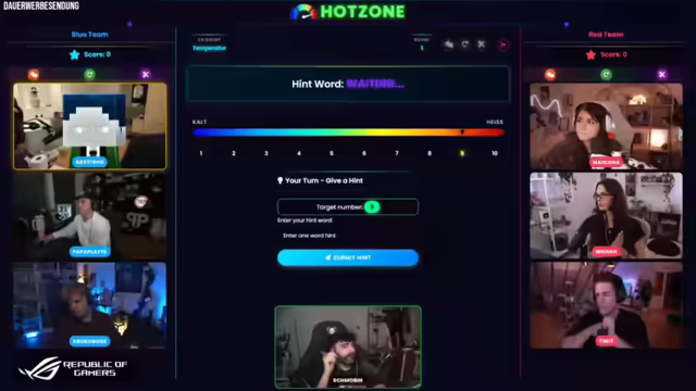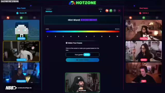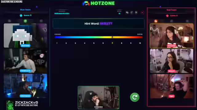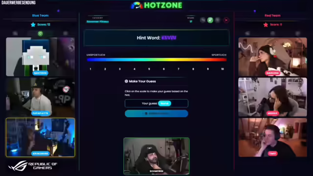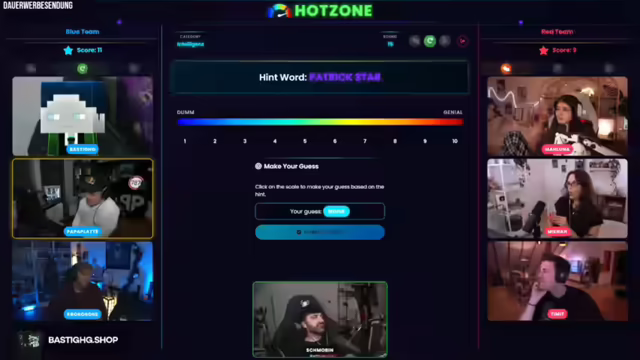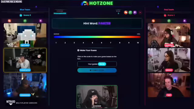 00:30:25Die erste Kategorie für Basti ist Sportart (1 entspannt, 10 extrem), er wählt das Wort "Golf". Mina erhält die Kategorie Game (1 einfach, 10 schwer) und wählt "Cookie-Clicker". Kevin bekommt Stream-Aktivität (1 wenig, 10 viel) und wählt "Feister". Das Team diskutiert über die Schwierigkeitsgrade und Aktivität der Streamer, um die richtige Zahl zu erraten. Bei Kevin wird die Zahl 7 ermittelt, obwohl das Team auf 6 getippt hat. Mina erhält die Kategorie "Traurigkeit" und wählt Lieblingsessen essen. Das Team diskutiert, wie glücklich Lieblingsessen essen macht und einigen sich auf die Zahl 8. Am Ende ist es die 9 geworden.