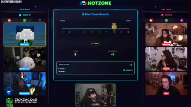 00:46:14Kroko erhält die Kategorie Geruch (1 stinkt, 10 riecht gut) und wählt "Haut". Das Team diskutiert, ob sie den Double-Punkte-Joker nutzen sollen, entscheiden sich aber dagegen und wählen stattdessen den Cut-Joker, um zwei Zahlen zu entfernen. Sie tippen auf die 5. Timit erhält die Kategorie Bekanntheit (1 unbekannt, 10 berühmt) und wählt "Timit". Das Team diskutiert, wie bekannt Timit im Vergleich zu anderen Persönlichkeiten ist und entscheidet sich für die 5. Basti erhält die Kategorie Wort (1 selten, 10 häufig) und wählt "Danke". Das Team überlegt, wie oft "Danke" im Vergleich zu anderen Wörtern gesagt wird.