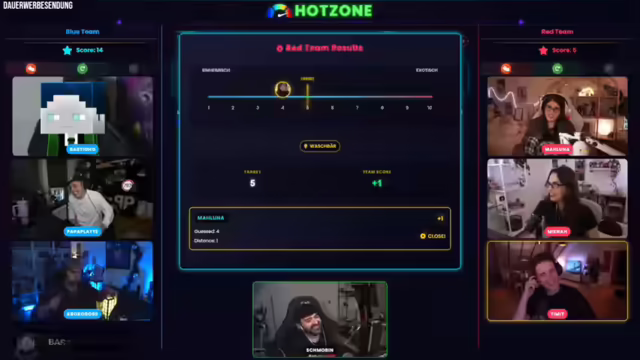 01:19:45Die Gruppe diskutiert, wie einheimische und exotische Tiere auf einer Skala von 1 bis 10 eingeordnet werden können. Koko äußert den Wunsch nach einem realen Tier und es wird überlegt, ob ein Waschbär als einheimisch oder exotisch einzustufen ist. Es wird festgestellt, dass es mehr Waschbären in Deutschland gibt, als man denkt, was zu einer niedrigeren Bewertung führt. Anschließend wird das Thema Stream-Ausfälle behandelt, wobei die Teilnehmer Gründe für das Ausfallen eines Streams bewerten sollen. Da Basti noch nie einen Stream ausfallen lassen hat, fällt es ihm schwer, einen Grund zu nennen. Es werden humorvolle Beispiele genannt, wie ein Hund, der auf die Diskade tritt oder das Chillen in der Badewanne mit Pflaumenmus. Letzteres wird als möglicher Grund für einen Stream-Ausfall in Betracht gezogen, aber als Joke eingestuft.