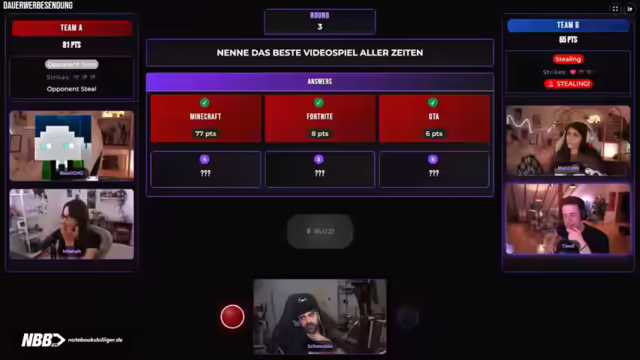 02:11:26Es wird über die Dauer von Customer Achievements gesprochen. Vorbereitung für das Zuschauerrätsel, bei dem erraten werden muss, welche Antworten am häufigsten genannt wurden. Es wird erklärt, dass beim Buzzern immer nur einer pro Team dran ist und dass, wenn die erste Antwort nicht genannt wird, das andere Team übertrumpfen kann. Es werden Bilder ausgetauscht, um die Hintergründe einzublenden. Es wird über den Konsum von Woldekwasser mit Geschmack diskutiert. Die erste Frage im Quiz lautet: 'Nenne die schönste Stadt Deutschlands'. Hamburg wird als erste Antwort genannt, gefolgt von München. Berlin wird genannt, ist aber nicht dabei. Es wird überlegt, welche Städte noch genannt werden könnten, wobei Heidelberg und Freiburg in Betracht gezogen werden. Frankfurt wird als Meme-Antwort diskutiert. Stuttgart wird genannt, ist aber nicht dabei. Frankfurt wird genannt, ist aber nur auf Platz 7. Heidelberg war die richtige Antwort.