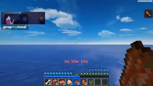 01:10:19Die spezielle Minecraft-Welt wird gezeigt: Sie besteht aus nichts als Wasser und dem eigenen Avatar. Der Streamer gibt einen Überblick über die vorgefundenen Bedingungen: Es gibt keine Strongholds, keine Strukturen und keinen Nether. Die einzigen Rohstoffquellen sind Drowns, die mit einer gewissen Wahrscheinlichkeit (je nach Version) Kupferingots, Angelschnüre oder Tridents droppt. Das Hauptziel der Challenge ist es, in der begrenzten Umgebung innerhalb von 24 Stunden etwas Bedeutendes aufzubauen, wobei das genaue Endresultat zunächst offenbleibt. Er erwähnt, dass Sterben und Wiederauferstehen erlaubt ist, aber Ressourcenverlust bedacht werden muss.