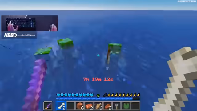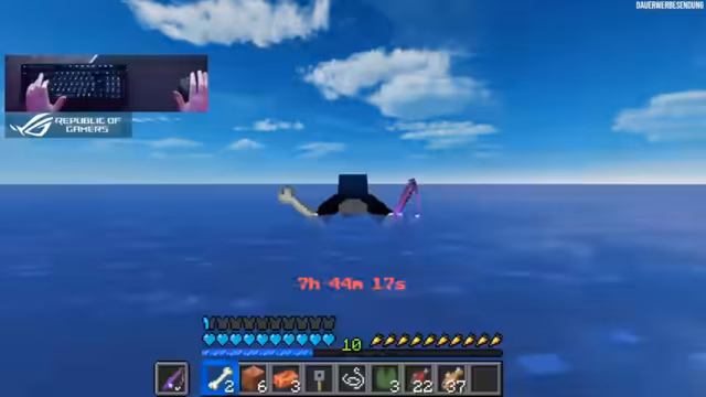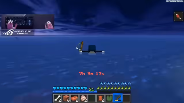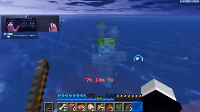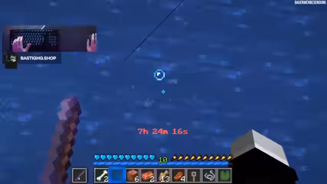 07:57:02Nach sechs Stunden des Streams hat der Streamer viele Drowns getötet und versucht, Angeln und Kupfer-Ingots zu sammeln. Er diskutiert statistische Wahrscheinlichkeiten und teilt mit, dass er auf sieben von acht Blöcken steht und eine Mending-Angel erhofft, um den Fortschritt in der Wasserwelt zu erleichtern.