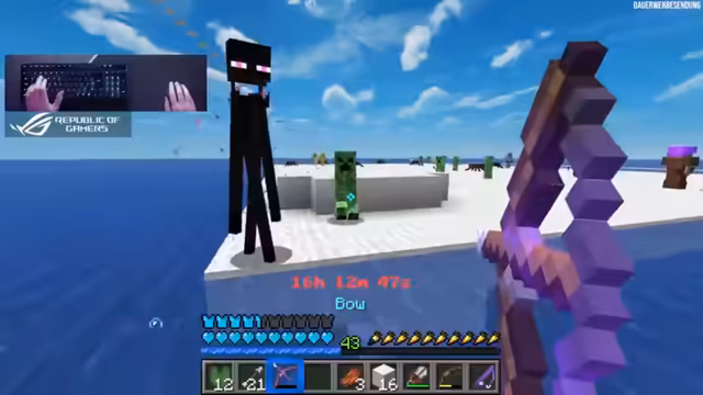 10:43:35Der Kern des 24-Stunden-Marathons ist die Duplikation von Strings in Minecraft, durchgeführt in einer komplett aus Wasser bestehenden Welt ohne vorherige Blöcke. Der Streamer nutzt einen Bug, bei dem Tripwire-Hooks durch Wasser zerstört werden und dabei statt zweier drei Strings zurückgeben, um ein kontinuierliches Duplikationssystem zu etablieren. Das Ziel ist es, aus diesen Strings Blöcke zu craften, da die gesamte Umgebung nur aus Wasser besteht und Ressourcen durch das Töten von Drowns zunächst rar sind. Die Konstruktion wird manuell aufgebaut und erfordert präzises Platzieren von Wasserquellen und Tripwire-Hooks.