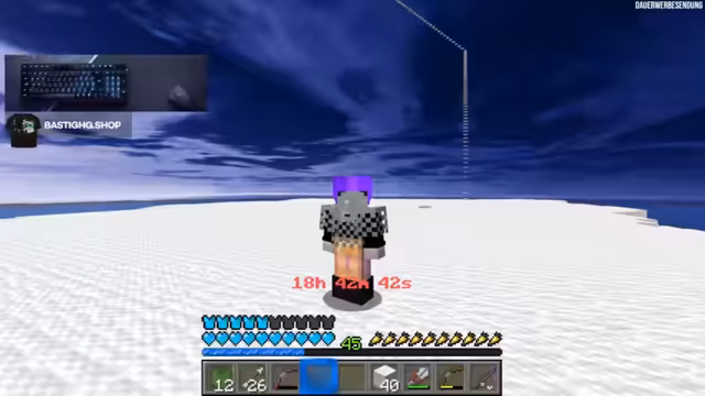 12:09:19Da der String-Duplikator nun läuft, konzentriert sich der Streamer auf den Bau der nächsten Ressourcenfarm. Um eine Schere herzustellen, die die Farm effizienter machen würde, benötigt er Eisen. Er kündigt an, eine Pathfinding-Farm zu bauen, die ähnlich wie in einem Skyblock funktioniert. Für den Aufbau benötigt er hunderte von Blöcken, die er nun farmt.