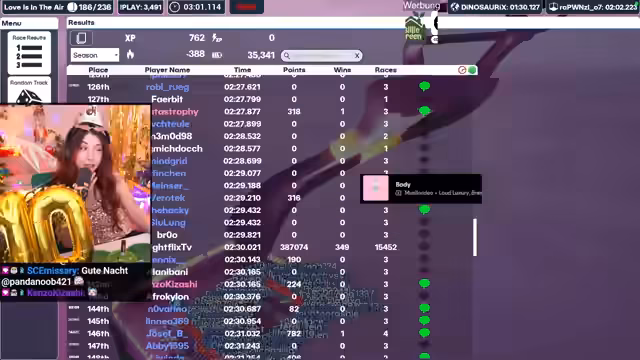 05:50:11Bei der Murmelbahn 'Love is in the air' gelten erneut reverse Regeln, um Abwechslung zu schaffen. Es wird über vergangene Events wie den Zufallstimeout-Generator bei Silvester gesprochen. Franzi199 wird die erste im Ziel und wird somit vielleicht für immer gebannt, während Nobody als Letzter einen VIP gewinnt. Dies wird humorvoll kommentiert und die Zeremonie des Abschieds und der Ehrung wird feierlich gestaltet.