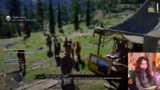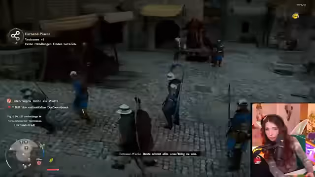 01:29:21Der Streamer erkundet die Spielwelt und interagiert intensiv mit Tieren wie Hunden und Katzen. Dabei bemerkt er eine Vertrauensleiste, die sich durch Streicheln erhöht. Er sammelt verschiedene Gegenstände wie Brombeeren, Hafer und eine Schatztruhe. Beim Versuch, die Stadt Hernand zu betreten, wird er aufgrund seines Outfits abgewiesen, was ihn zu alternativen Lösungen wie dem Klettern über eine Mauer zwingt.