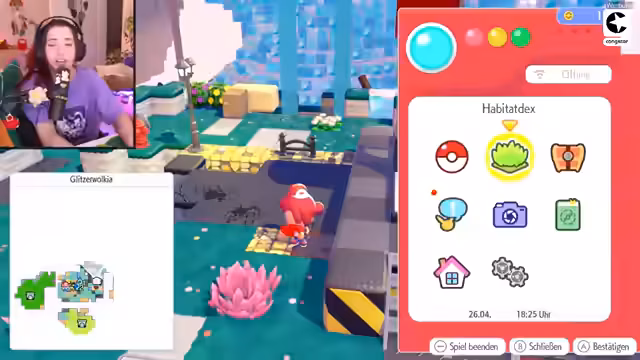 04:21:42Der Streamer entdeckt ein neues, schwebendes Inselgebiet namens Glitzer Wolkia in Procopia. Er ist baff über die Größe des Spiels und die vielen Inhalte. Dieses ist das fünfte Gebiet, das er erkunden kann, wo er wieder ein Pokémon Center aufbauen und die Gegend gestalten muss.