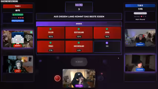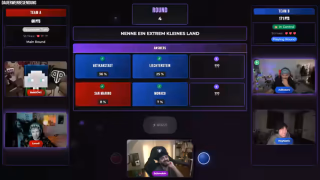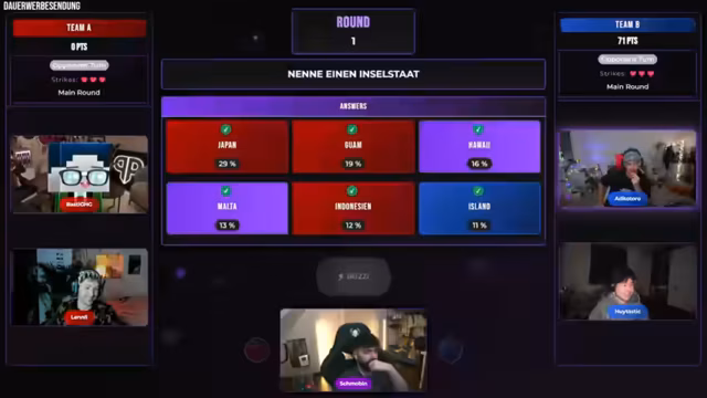 00:13:33Robin Schmobben erklärt das Format des Geo-Quiz, bei dem zwei Zweierteams antreten: Basti und Lennlis bilden ein Team, Adi und Hui das andere. Die Aufgabe besteht darin, die häufigsten Antworten der Zuschauer auf gestellte Fragen zu erraten. Es geht nicht um die korrekte Antwort, sondern um die populärste. Die erste Frage lautet: „Nennt mir bitte einen Inselstaat.“ Adi buzzert zuerst und nennt Kuba, was jedoch nicht in den Top 6 ist. Basti nennt Japan, was mit 29 % die Top-Antwort ist. Das Team von Basti und Lennlis darf weiterspielen. Basti versucht es mit Australien, das ebenfalls nicht in den Top 6 ist. Lennlis nennt UK, auch ohne Erfolg. Nach Beratung nennen sie Guam (19 %) und Indonesien (12 %), bevor sie mit Madeira scheitern. Adi und Hui können die Runde klauen und nennen Island, das mit 11 % auf Platz 6 landet. Hawaii und Malta wären ebenfalls richtige Antworten gewesen.