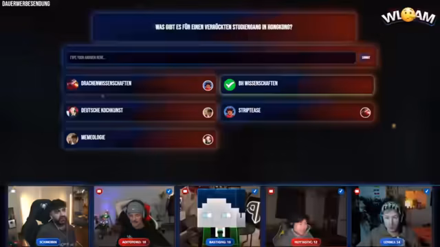 01:47:44Die letzte Quizfrage drehte sich um einen verrückten Studiengang in Hongkong. Die Teilnehmer schlugen Drachenwissenschaften, BH-Wissenschaften, deutsche Kochkunst, Striptease und Mimeologie vor. Die BH-Wissenschaften (Bra Studies) erwiesen sich als die korrekte und amüsante Antwort. Nach dieser Runde wurde Lennly als Gewinner des Quiz gekürt, wobei alle Teilnehmer auf dem Podest landeten. Im Anschluss an das Quiz musste der geplante Geo-Abend mit Lennly aufgrund von Krankheit abgesagt werden, was zu einer Änderung des Stream-Plans führte. Der Stream sollte stattdessen mit einer Minecraft-Challenge fortgesetzt werden, bei der es darum ging, den Wither im Nether zu besiegen, wobei Items nur durch Mob-Drops erhältlich waren. Die aktuelle Mission war das Farmen von Essen und Pfeilen, während der Streamer auch über sein neues Gaming-Rig und seine Erfahrungen mit verschiedenen Lenkrädern für Rennspiele sprach.