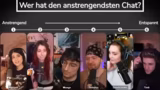 04:16:20Die Streamerinnen und Streamer führen eine lockere Diskussion darüber, welcher Chat der anstrengendste sei, wobei sie sich gegenseitig roasten. Mazat wird für seinen als besonders chaotisch geltenden Chat in die Kritik genommen, während Baso einen sehr süßen und entspannten Chat, der jedoch manchmal spammt, und Tim einen Chat mit einem hohen weiblichen Anteil und intelligenten Gesprächen hat.