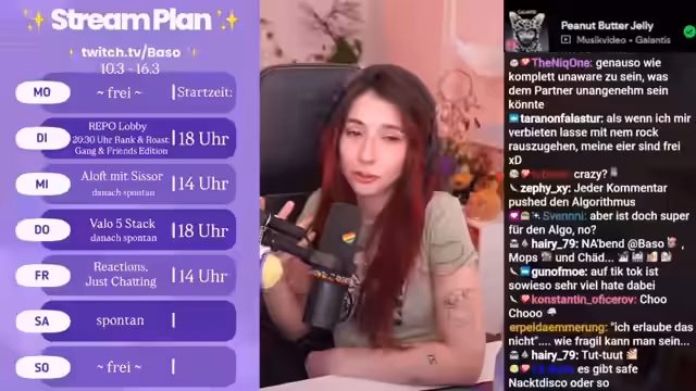 05:41:52Nach zahlreichen Unterbrechungen wird der geplante Stream der Woche vorgestellt. Für den nächsten Tag wird ein gemeinsames Aloft-Session mit Therese angekündigt. Am Donnerstag steht ein Valorant-Five-Stack mit Tim Horus, Bart, Emi und Lily the Chili auf dem Programm, der eine Stunde nach Streambeginn startet. Am Freitag ist ein langer Stream von 14 bis 20 Uhr geplant, bei dem mit hoher Wahrscheinlichkeit ein Dating-Format-Video angeschaut wird. Für Samstag ist noch kein fester Plan vorhanden, der Stream ist spontan. Der Plan wird im Discord und auf Instagram kommuniziert und bleibt flexibel.
