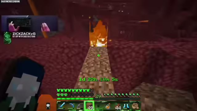 01:45:44Nach längerer Zeit betritt der Streamer den Nether, in der Hoffnung, dass kein Raid-Monster wartet. Die Border ist nicht mehr sichtbar. Es wird eine Richtung eingeschlagen, in der Hoffnung auf Glück. Überraschenderweise wird schnell eine Festung entdeckt, was den Streamer interessiert, wann diese sonst erreichbar gewesen wäre. Er erklärt, dass die Umrechnung von 1 zu 8 zwischen Nether und Overworld existiert, aber die Welten dadurch nicht unterschiedlich groß sind. Der Nether ist nicht kleiner, sondern man kommt nur an anderen Koordinaten raus. Ohne Probleme wird die Festung bei 300er-Koordinaten erreicht. Netherwarzen werden für Heiltränke mitgenommen und der erste Blaze Rod wird erbeutet, was einen neuen Maßstab im Projekt darstellt.