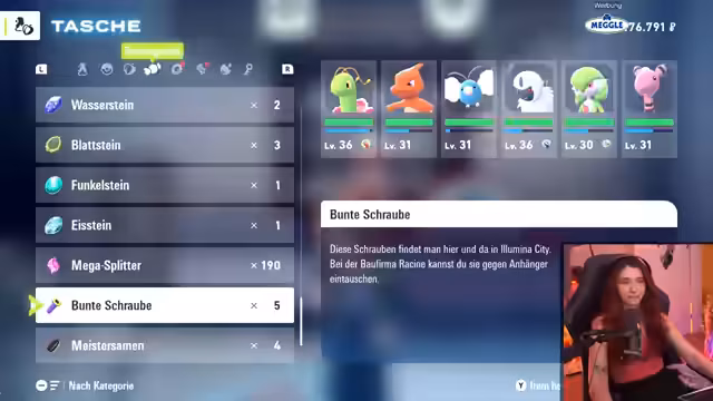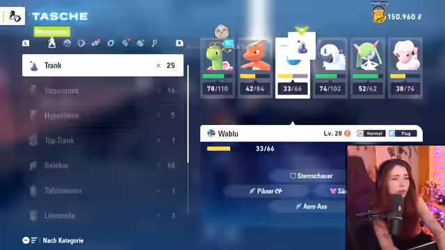 00:43:08Nach einer längeren Unterbrechung kehrt die Streamerin zu Pokémon zurück und überprüft ihren Fortschritt. Sie stellt fest, dass sie Rang F erreicht hat und 51 Pokémon gefangen sowie 92 gesehen hat. Sie plant, die Hauptmission fortzusetzen, um wieder in die Geschichte einzusteigen. Eine unerwartete Nebenmission, bei der sie Unratütox-Pokémon mit „Gourmetmüll“ zu Mülltonnen locken muss, sorgt für Belustigung. Die Streamerin kommentiert die Absurdität der Quest, bei der sie sich wie eine „Enten-Mama“ fühlt, die ihre Babys führt. Sie erhält fünf Fensterbälle als Belohnung und reflektiert über die Notwendigkeit, auch als Pokémon-Meister den Müll wegzubringen. Sie entdeckt auch die Möglichkeit, Mega-Splitter gegen Mega-Murmeln einzutauschen, die für Mega-Entwicklungen von Pokémon benötigt werden.