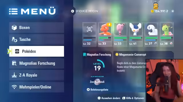 01:55:35Die Streamerin entwickelt ihr Lorblatt zu Meganie, was sie mit großer Freude erfüllt. Sie ist begeistert von der Schönheit und Größe ihres neuen Pokémon und entscheidet sich für die Attacke Laubklinge. Nach der Entwicklung kann Meganie auch sofort die Mega-Entwicklung durchführen, was sie als 'süß' und 'toll' empfindet. Sie ist fasziniert davon, wie Meganie ihr hinterherläuft und die Blumen um den Hals in der Mega-Entwicklung zunehmen. In der Kampfzone trifft sie auf verschiedene Gegner, darunter ein Glutexel und ein Bisaknosp. Sie bemerkt, dass ihre Pokémon, insbesondere Meganie, im Vergleich zu anderen Teammitgliedern überlevelt sind, während andere Pokémon wie Vati deutlich unterlevelt sind. Dies führt zu Schwierigkeiten in den Kämpfen und der Erkenntnis, dass sie ihr Team ausbalancieren und die schwächeren Pokémon leveln muss, um zukünftige Herausforderungen zu meistern.