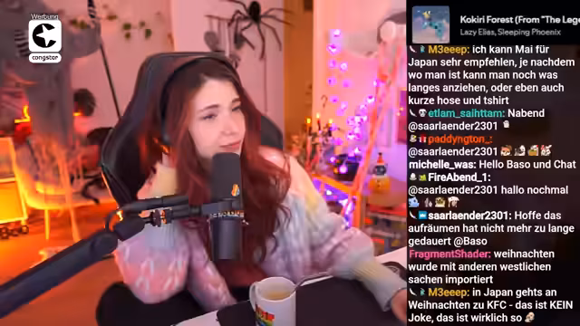 00:19:12Die Streamerin äußert sich kritisch zu Coworking-Streams, da sie sich zu leicht ablenken ließe und den Fokus auf die Arbeit verlieren würde. Sie bewundert Streamer, die solche Formate erfolgreich umsetzen können, da sie selbst das Bedürfnis hätte, unterhaltsam zu sein und einen Mehrwert zu bieten. Ein Zuschauer berichtet von einer bevorstehenden Japanreise im Dezember, was die Streamerin zu eigenen Reiseerinnerungen anregt. Sie teilt ihre Erfahrungen von ihrer ersten Japanreise im September des Vorjahres und rät davon ab, im Hochsommer dorthin zu reisen, da die hohe Temperatur und Luftfeuchtigkeit sehr anstrengend sein können. Die Neugier auf das Wetter in Japan im Dezember führt zu einer kurzen Recherche, die kältere Temperaturen offenbart. Die Streamerin fragt sich, wie Weihnachten in Japan gefeiert wird, da sie diesbezüglich ungebildet sei.