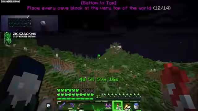01:41:58Der Streamer beginnt mit dem Platzieren der geforderten Höhlenblöcke auf der maximalen Bauhöhe. Nach anfänglicher Unsicherheit darüber, welche Blöcke genau als 'Höhlenblöcke' gelten, platziert er Blöcke wie Cleanstone, Diorite, Gravel und Dripstone. Der Chat interagiert dabei durch Emojis wie 'O7' und reagiert humorvoll auf den Streamer, der versehentlich mit einem Totem des Unsterblichen auf der Hand zu sein scheint, während er die Blöcke platziert.