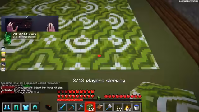 05:17:03Die Gruppe feiert den Bau einer neuen EP-Farm, die bereits an Tag 1 des Projekts fertiggestellt wurde. Sie planen, die Farm in Betrieb zu nehmen, obwohl sie noch nicht vollständig optimiert ist. Während der Inbetriebnahme kommt es zu einem unerwarteten Angriff von Skeletten, die die Golems töten, was zu Frustration führt. Der Streamer und seine Mitspieler müssen die Farm erneut ausleuchten und reparieren. Ein Mitspieler vergleicht die Situation mit einer Projektarbeit, bei der man nur so tut, als ob man etwas macht. Die Reparaturarbeiten werden schnell in Angriff genommen, um die Funktionalität der Farm wiederherzustellen.