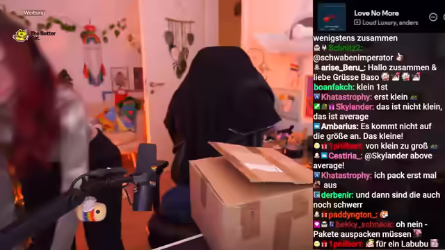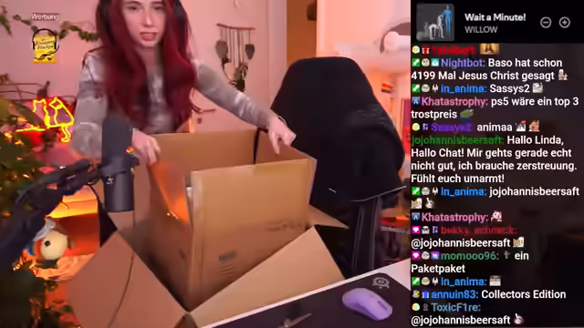 01:34:55Zur Feier des Abends und des bevorstehenden Zockens mit Ghost of Yotei wird eine vielfältige Getränkeauswahl präsentiert, bestehend aus Cola, Tee, Wasser und Traubensaft mit Wasser. Es wird die Frage aufgeworfen, ob es normal ist, mehrere Getränke gleichzeitig zu konsumieren, da jedes Getränk unterschiedliche Bedürfnisse befriedigt. Anschließend werden zwei Pakete von Playstation erwähnt, wobei unklar ist, was sich darin befindet. Es wird spekuliert, dass der Inhalt im Zusammenhang mit Ghost of Yotei steht. Der Chat darf entscheiden, welches Paket zuerst geöffnet wird, wobei die Wahl auf das kleinere Paket fällt. Es wird vermutet, dass sich im Paket möglicherweise ein Katana befindet, was jedoch unwahrscheinlich erscheint. Stattdessen werden ein Shirt und eine Maske erwartet. Die Erwartungen werden jedoch heruntergeschraubt, um Enttäuschungen vorzubeugen.