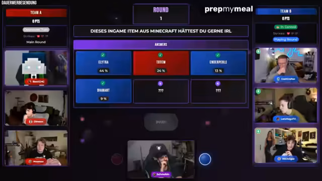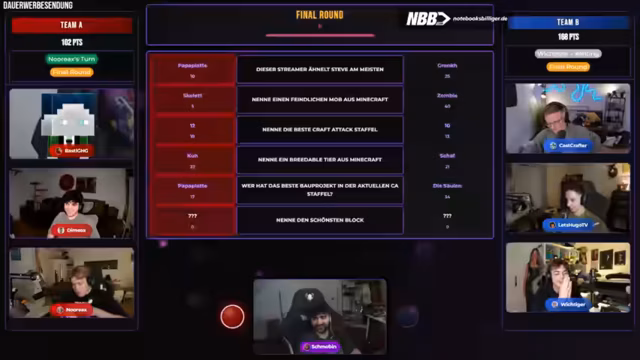 02:33:33Im Finale der Quizrunde lautete die Frage nach einem Item, das Eisen zum Craften benötigt. Nach verschiedenen Vorschlägen wie Eisenblock, Spitzhacke und Eisenschwert, entschied sich das Team letztendlich für „Eimer“. Anschließend wechselte das Stream-Format zu einem Wettbewerb zwischen den Teams Blau und Rot. Das Finale wurde jedoch von technischen Pannen überschattet, da der Stream für kurze Zeit einfror und der Streamer versehentlich sein Passwort auf den Bildschirm schrieb. Nach der Behebung des Problems konnte das Spiel fortgesetzt werden.
