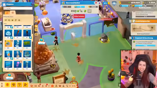 05:59:54Um die andauernden Probleme mit dem Souvenirladen, der oft unbesetzt ist, und der fehlenden sanitären Anlagen zu lösen, beschließt der Streamer, einen Personalraum und Toiletten einzurichten. Die dafür notwendigen Objekte wie ein Trinkbrunnen und eine Waschbecken-Wand sind zwar hässlich, aber funktional. Die Gestaltung ist ihm jedoch ein Dorn im Auge und er bezeichnet sie als 'mutig' und 'eklig'.