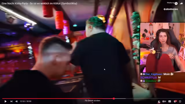 01:47:49Nachdem die Gruppe den Club betreten hat, schildert der Streamer seine Eindrücke. Die Stimmung wird als positiv aufgeladen und angespannt beschrieben, was eine gewisse Energie in der Luft spürbar macht. Er beobachtet, dass die meisten Gäste primär tanzen und soziale Kontakte pflegen. Sexuelle Handlungen finden vereinzelt statt, sind aber nicht die Hauptaktivität. Es gibt auch einen separaten Bereich für intime Begegnungen, wobei das Geschehen nicht offen angestarrt wird.