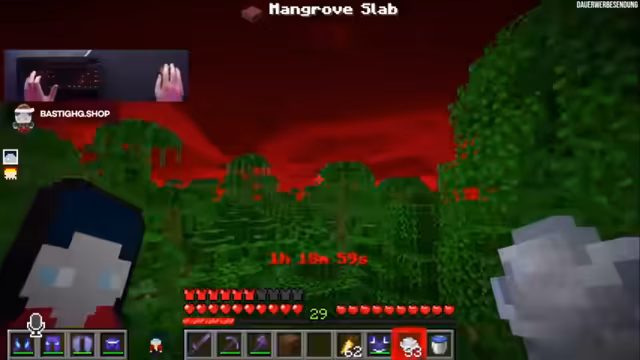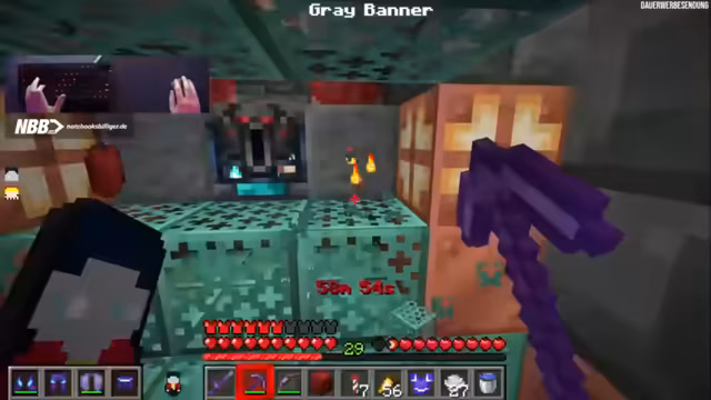 04:10:03Der Streamer fragt, ob er in der Nähe eines Mangroven-Bioms Matsch mitnehmen soll, da er diesen für das nächste Item benötigt. Er hat bereits zwölf Matsch und benötigt Weizen sowie einen Ofen. Die nächste Nacht bündelt die Übergänge nicht wie gewünscht. Der Streamer spekuliert, bei welchem Team es am meisten kriselt und tippt auf Wichtiger und Fuchse. Stigi kümmert sich um Weizen und Matsch, um Mud Bricks herzustellen, die dann im Stonecutter zu Mud Brick Slabs verarbeitet werden. Der Streamer findet einen Stonecutter und Cyan-Farbstoff, womit ein Cyan-Banner hergestellt werden kann. Er kümmert sich auch um neue Wolle. Raw Copper wird gesammelt, und das Team hat eine gute Serie. Der Streamer hat eine kleine Basis gebaut und feiert dies. Er hat Kupfer gebraten, obwohl es roh benötigt wurde, und muss eine neue Spitzhacke herstellen. Raw Copper ist erledigt, gefolgt von Flint and Steel und Kaktus. Carved Pumpkin ist auch erledigt. Das nächste Item ist 'Purple Stained Glass', wofür Blau und Rot kombiniert werden müssen. Der Streamer hat zu wenig Brennmaterialien und muss mit einer Holzspitzhacke anfangen. Er achtet darauf, dass seine Schalker-Box nicht explodiert. Das Team erhält 'Heart of the Sea' und 'Tough Stairs'. Das nächste Item ist 'Light Blue'. Danach kommen 'Red Nether Bricks', die aus gebratenem Netherrack und zwei Netherwarzen hergestellt werden. Der Streamer geht erneut in den Nether, um eine Festung zu finden.