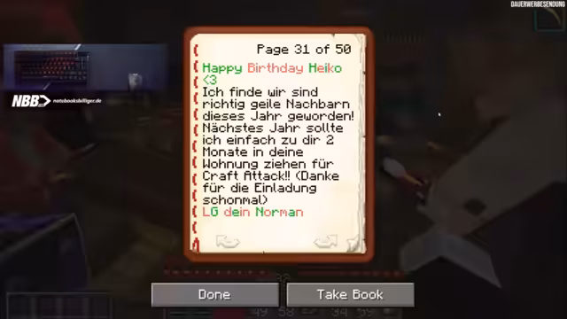 06:46:21Die Streamer diskutieren über die Wahl zwischen Holz- und Steinstrommasten für ihr Bauprojekt, wobei die Ästhetik und der Kontrast zur Straße im Vordergrund stehen. Währenddessen wird Heikos Geburtstag gefeiert, der um Mitternacht beginnt. Ein besonderes Geschenk wird enthüllt: ein aufwendig gestaltetes Buch in Minecraft, das von verschiedenen Personen mit persönlichen Nachrichten und Anspielungen gefüllt wurde. Die Streamer sind sichtlich beeindruckt von der Kreativität und dem Umfang des Geschenks, das humorvolle und persönliche Details enthält, wie die Flugstrecke seit dem letzten Geburtstag oder Anspielungen auf frühere Ereignisse und Charaktere. Die Freude über das detailreiche und liebevoll gestaltete Geschenk ist groß, und es wird über die Möglichkeit gesprochen, es physisch drucken zu lassen.