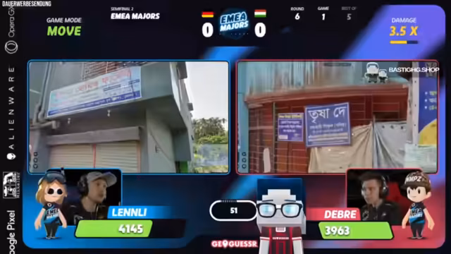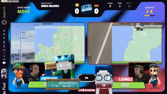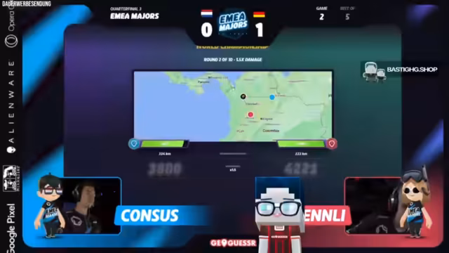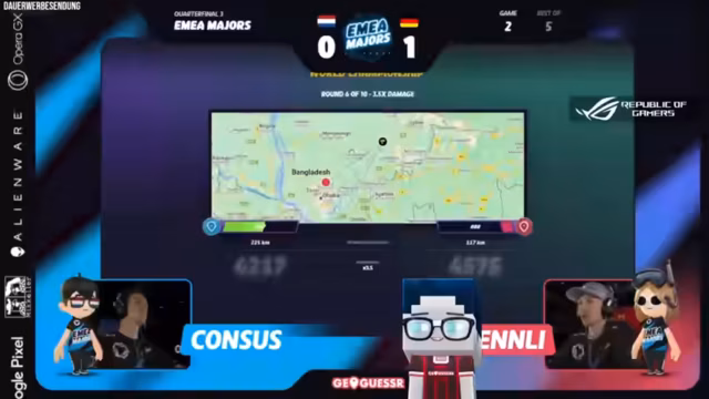 02:13:45Die erste Runde des Spiels zwischen Lenly und Consus beginnt im Moving-Modus und findet in den USA statt. Lenly, für den dies der schwächste Spielmodus ist, holt sich dennoch den ersten Punkt, indem er einen sehr guten Guess abgibt. Consus reagiert frustriert und macht in der folgenden Runde in den Niederlanden einen Fehler, der ihm viel HP kostet. Trotz anfänglicher technischer Probleme und dem Ausstieg der Spieler läuft das Spiel nun planmäßig weiter.