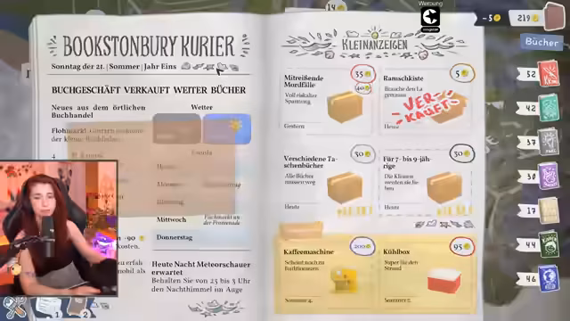 03:04:18Zu Beginn des Streams blickt der Streamer auf die längere Pause seit der letzten Spielsitzung zurück. Er geht über die bisher in 'Tiny Bookshop' erledigten Quests, wie das Besuchen der Küstenpromenade und das Beschaffen von Briefmarken, und erinnert sich an anstehende Aufgaben, wie den Besuch des Megaspartags und den Verkauf von 15 Dramabüchern am Leuchtturm. Für den aktuellen Tag entscheidet er sich aufgrund des schlechten Wetters für einen Gang ins Café, um dort Bücher zu verkaufen und Kunden zu beraten.