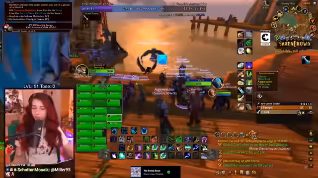 01:31:21Die Gruppe beschäftigt sich mit mehreren Quests, wie 'Kopf des Aufsehers' und 'Gefährlicher Pakt'. Der Streamer erklärt, dass manche Gruppenquests auch übersprungen werden können. Es werden Gegenstände wie Frostöl und diverse Materialien für Gildenmitglieder gefarmt. Der Kampf gegen den Mob 'Twilight Fireguard' wird vorbereitet, wobei Heiler auf Range bleiben sollen, um den Area Damage des Mobs zu vermeiden.