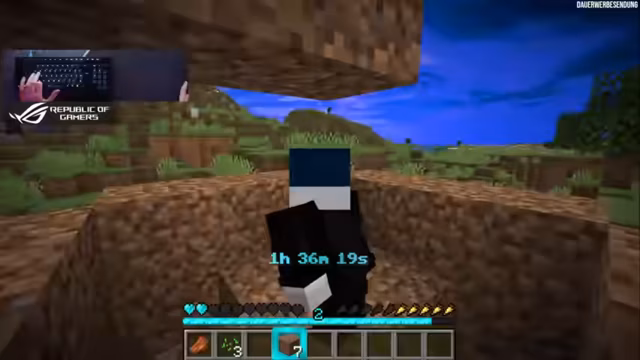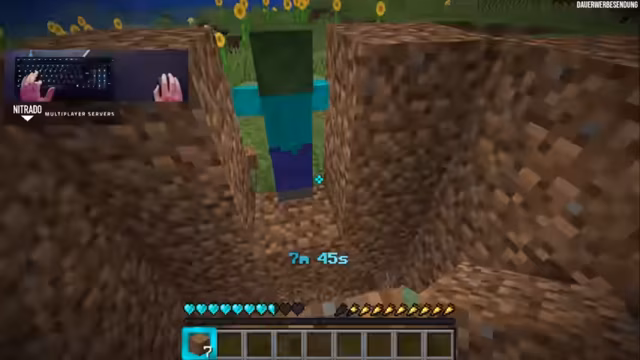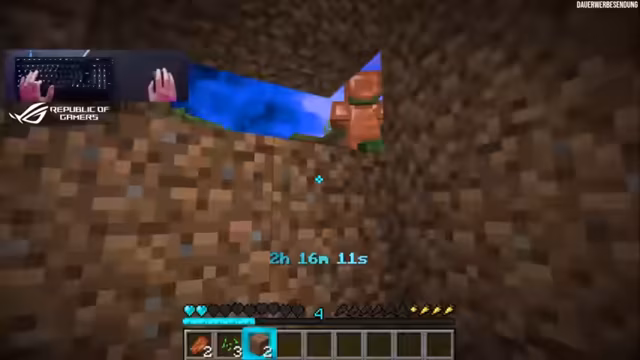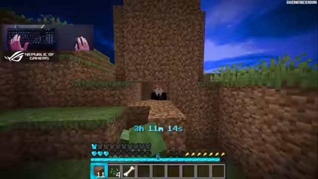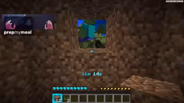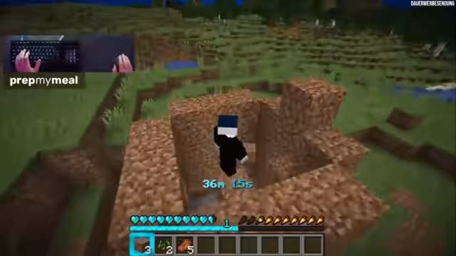 00:18:02Nachdem eine Welt generiert wurde, beginnt der Streamer seine Aktionen. Das Ziel ist es, Ressourcen wie Holz und Essen zu sammeln, ohne dabei Blöcke zu laufen. Da das Laufen Schaden verursacht, wird eine Falle konstruiert, um Zombies anzulocken und diese aus der Distanz zu töten, um an deren Rotten Fleisch als Nahrung zu gelangen. Der Start gestaltet sich jedoch schwierig, da unerwartete Kreaturen wie ein Spider Jockey spawnen.