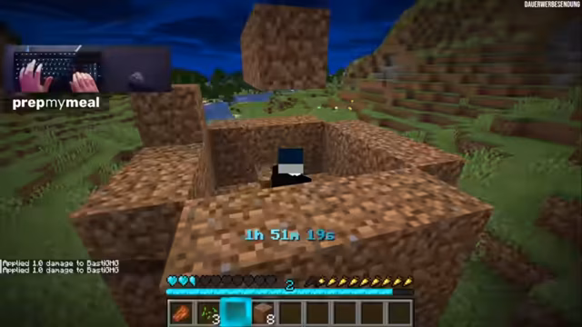 00:53:25In der zweiten Nacht stabilisiert sich das System etwas, doch unerwartete Probleme wie reitende Skelette mit Speeren erschweren das Überleben. Nachdem einige Ressourcen gesammelt wurden, wird der Streamer von einem Creeper überrascht und erleidet erheblichen Schaden. Neben dem Gameplay wird ein Sponsor, PrepMyMeal, beworben, der mit einem Rabattcode beworben wird, der Zuschauern bei der Essensplanung helfen soll.