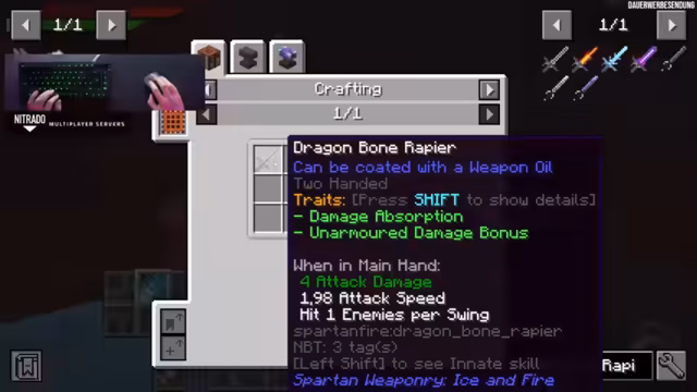 03:21:00In der Netherfestung wird ein mobiler Beglier entdeckt, der fortan als Begleiter dient und in einen Eimer gesteckt werden kann. Der Fokus verlagert sich nun auf die Planung der nächsten Ausrüstungsziele. Es wird beschlossen, sich eine Netherite-Rüstung anzufertigen, wofür jedoch erst die benötigten Materialien wie Netheritbarren gesammelt werden müssen. Parallel wird über die Herstellung neuer Schwerter, wie das Ice Dragonbone Katana, nachgedacht, um den Arsenal für zukünftige Herausforderungen zu erweitern.
